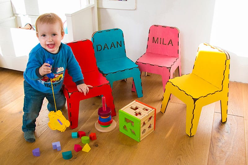 Je hebt dus ook de leuke stoeltjes van hetzelfde materiaal. Je kan er de naam van je kindje uit laten snijden. De stoeltjes en tafeltjes zijn in allerlei kleuren te verkrijgen. Je kan ze ook zelf beschilderen. In het volgende artikel laat ik zien hoe je het stoeltje kan beschilderen. Ik zal dan ook een paar voorbeelden laten zien. Het stoeltje is iets kleiner dan de standaard maat stoeltjes, waardoor de kinderen rond 10 maanden er al mee kunnen leren opstaan en lopen. Het stoeltje is namelijk heel licht en sterk. Met 1,5 jaar kunnen ze er echt al goed op zitten en kan je het stoeltje gebruiken voor kinderen nul tot en met vier jaar.