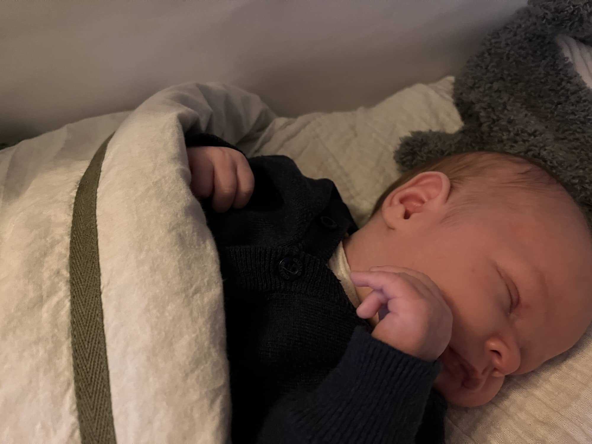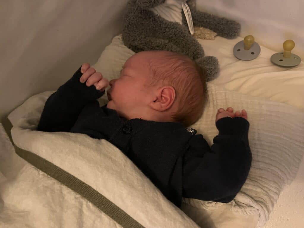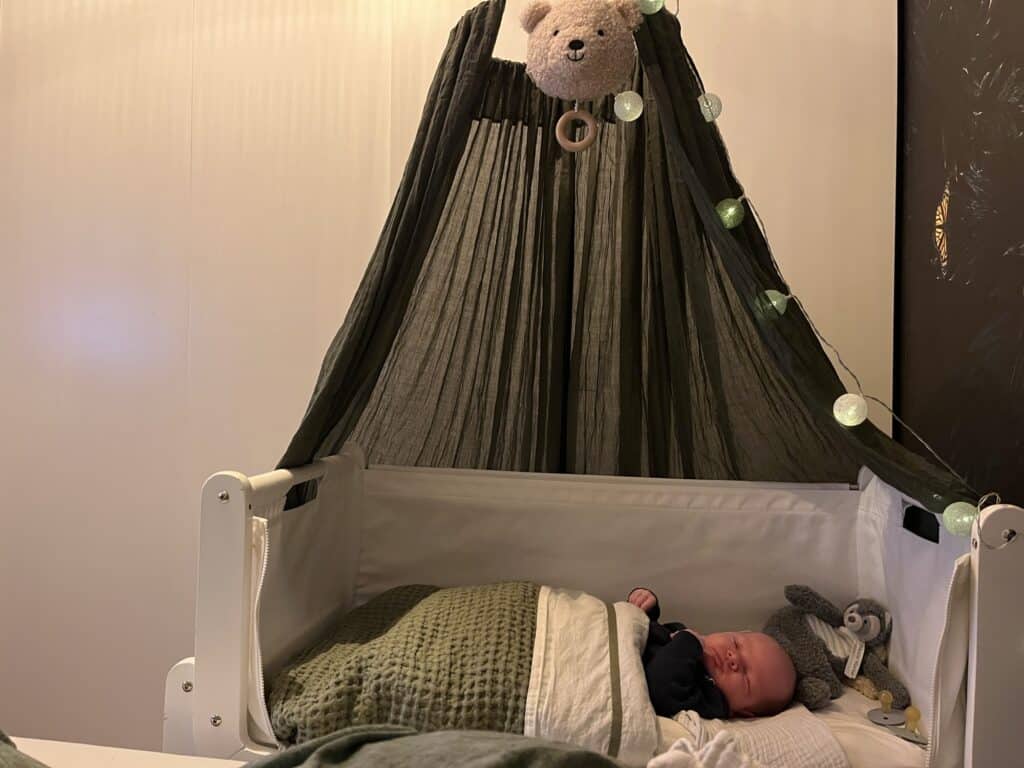 Alle vier de kinderen hebben in een co-sleeper geslapen. Dat is een wiegje die je vast kan maken aan je eigen bed. De bodem van dat wiegje is even hoog als je eigen bed. Dat vind ik zelf praktischer dan een dichte wieg, omdat je dan eerst uit bed op moet gaan staan om ze te pakken. Daarnaast werden alle kinderen geboren met een keizersnede. Dus op staan was sowieso lastig voor mij. Ze worden op het begin toch wel elke drie uur wakker.
