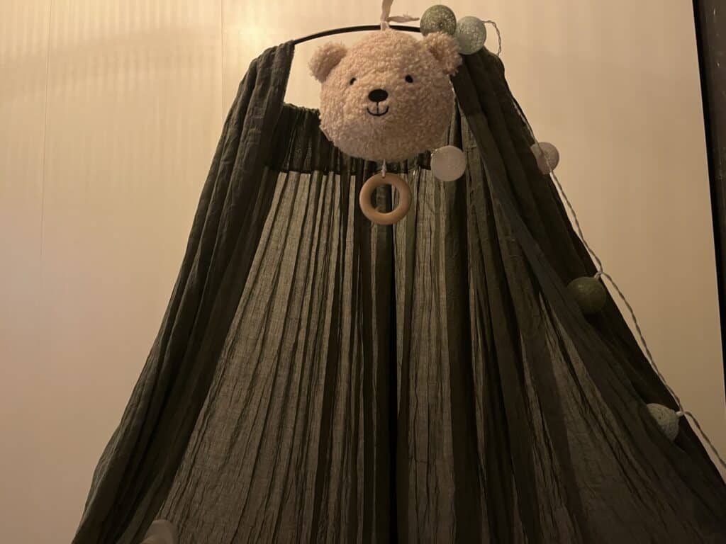 Op onze muur hebben we een leuk behang van een kaketoe. Graag wilde ik kleuren die een beetje matchen met dat behang. Ik heb de kleur groen hier uit gehaald. De co-sleeper heeft een mooie sluier in de kleur donkergroen. Daarnaast heb ik gekleurde balletjes opgehangen waar batterijen in zitten. Deze doe ik ‘s nachts aan wanneer ik borstvoeding ga geven. Er komt net genoeg licht vandaan. Ook kijkt Owen naar de lichtjes als hij even niet slaapt. Het lijkt voor hem wel rustgevend. Soms staan ze dus een hele nacht aan.