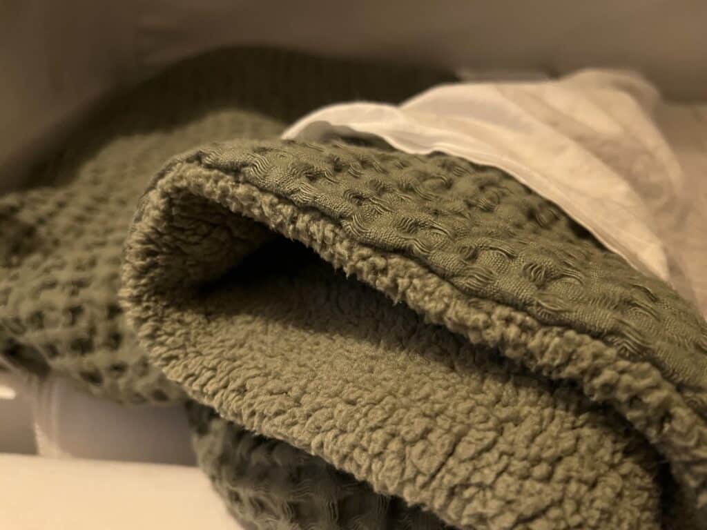 De deken heeft aan de bovenkant een wafel dessin en aan de onderkant zit een lekkere warme stof.