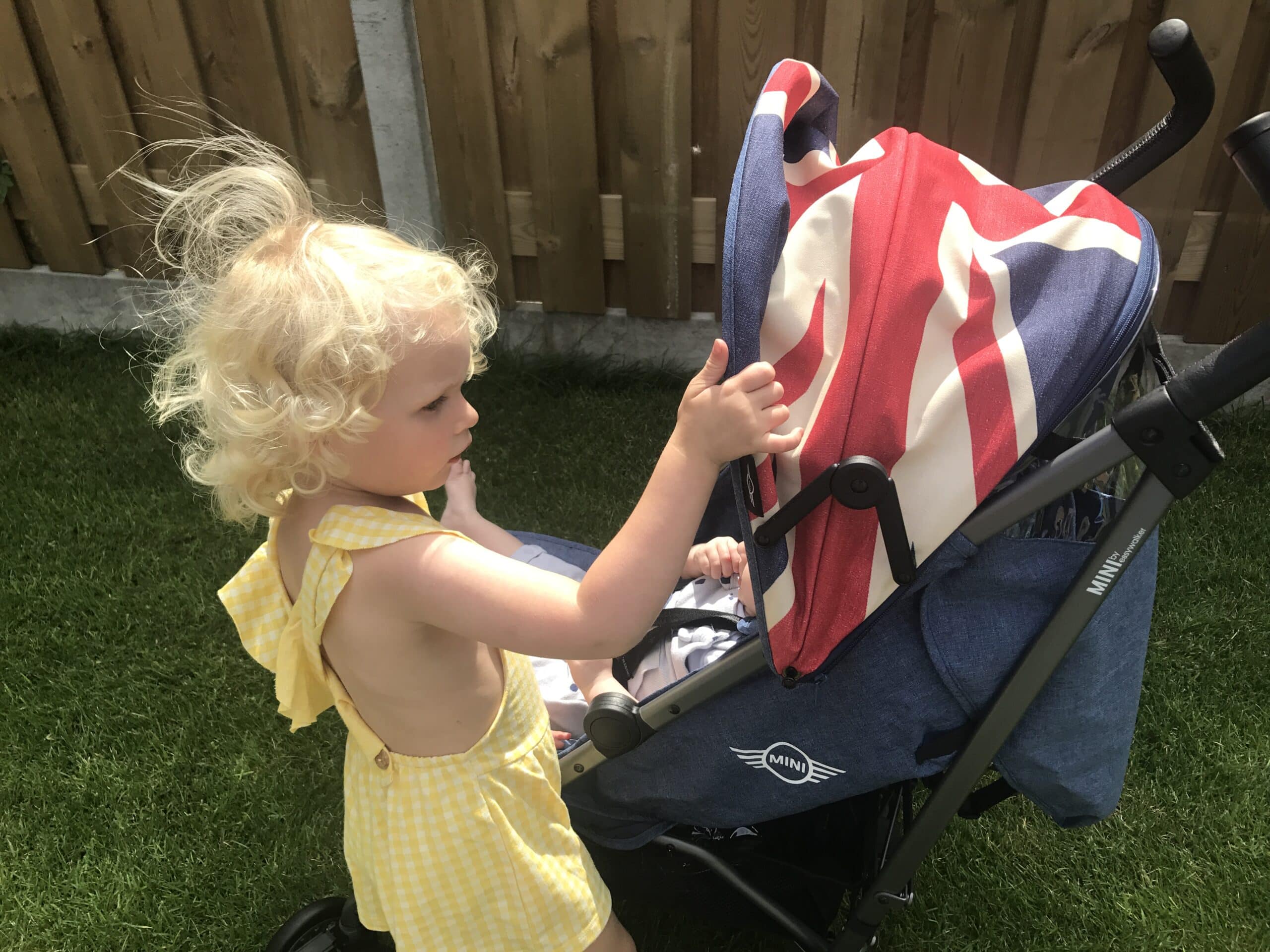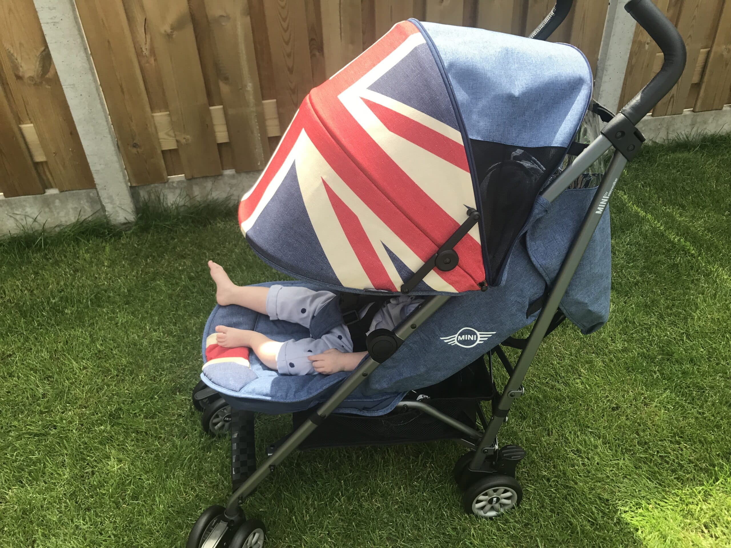 Wat ik ook altijd heel belangrijk vind is de uitstraling, kleuren en dessin. Deze is echt heel mooi vind ik zelf. Hij is van een mooie stof gemaakt, jeanskleurig en er staat een Engelse vlag op de kap. Ik ben meestal niet zo van de vlaggen, maar deze past er mooi bij. Wat ik ook erg leuk vind is dat deze buggy van het merk MINI is. Hetzelfde merk als die van de MINI Coopers. Het logo mag er daarom ook wel op staan! Ik heb namelijk meestal een hekel aan logo’s die pontificaal aanwezig zijn op een product, maar deze mag er wel zijn.