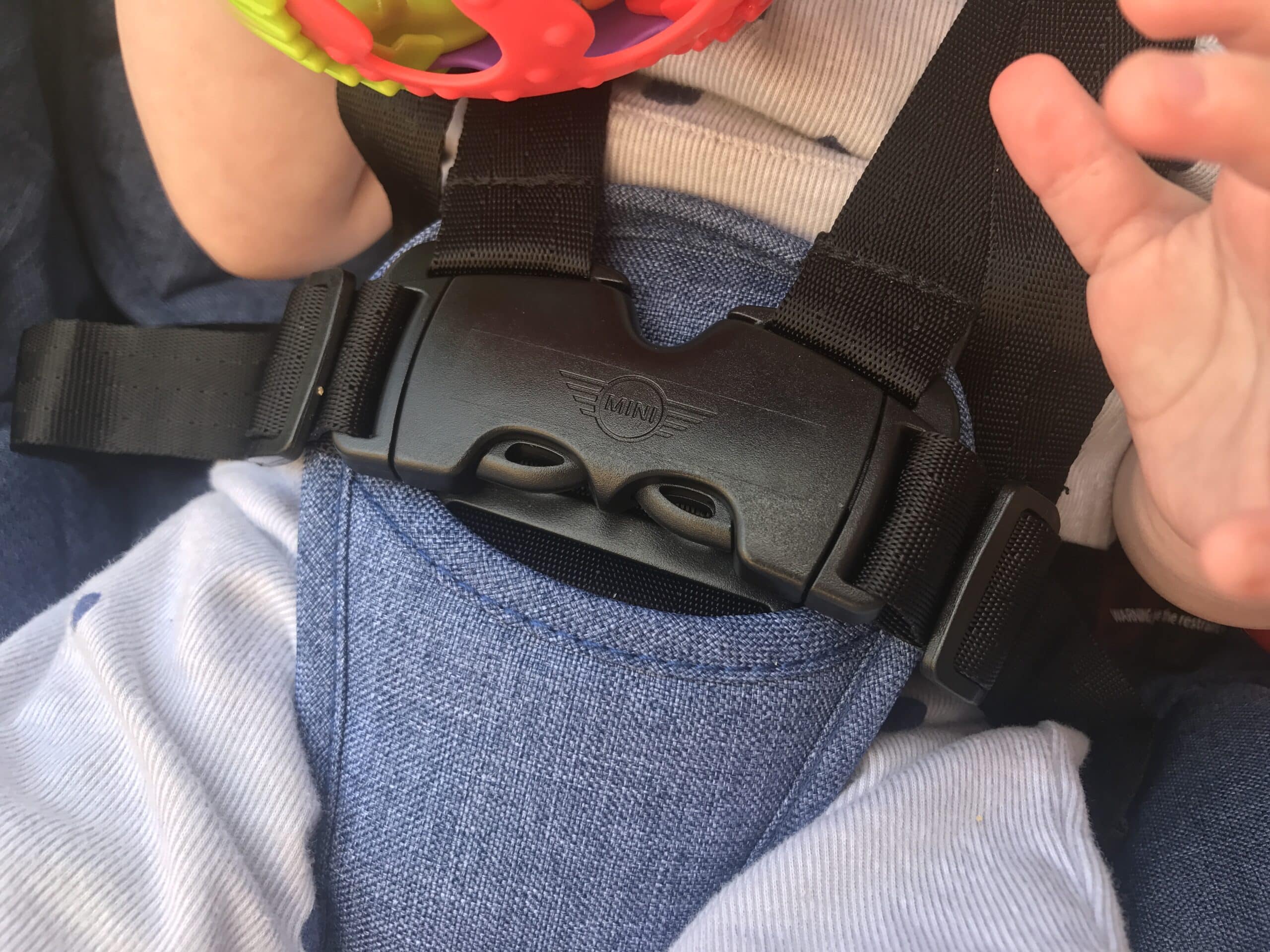 Je maakt je kindje vast met een driepuntsgordel. Hij gaat erg makkelijk dicht. Je steekt de twee gordels die over de schouder gaan in de middelste gordel. Door te knijpen gaat deze weer open.