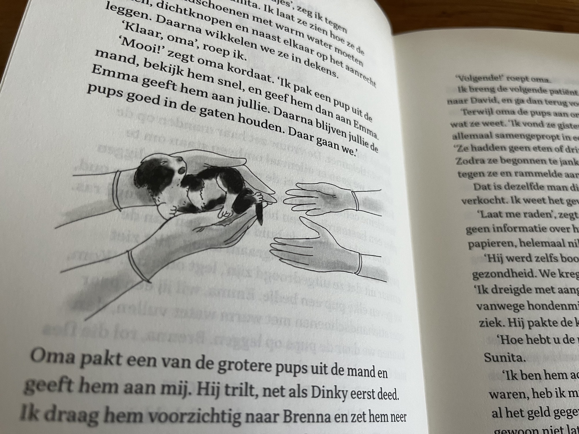 De illustraties in het boek zijn ook heel leuk. Ze zijn kleurrijk en maken het verhaal nog levendiger. De puppy’s zien er zo schattig uit zegt Nola. Illustraties zijn toch nog wel heel leuk en belangrijk in de boeken. Voor Nola is het ook fijn zodat ze nog meer een beeld heeft van het verhaal.