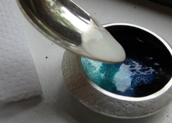 Om kleur in de bedel te krijgen wordt er gewerkt met emaille. Dit is gekleurd glas wat in vloeibare vorm op de bedel wordt aangebracht. Zodra de emaille gedroogd is, wordt het vast gesmolten op het zilver. Dit gebeurt met ongeveer 750-800 graden in een speciale oven. Je kunt kiezen voor elke kleur emaille bij Inner Jewels. Ik heb gekozen voor de kleur Jade aangezien dit de tweede naam van Lille is en dit het nog specialer voor mij maakt.