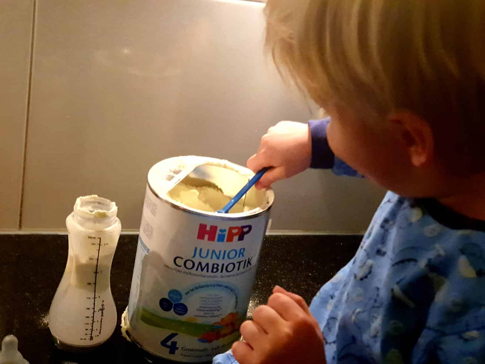 Liam die houdt niet van gewone melk. Die bleef flesvoeding drinken. Op een gegeven moment zijn we over gegaan op dreumesmelk. Deze vindt hij erg lekker. Hij is eigenlijk een peuter, maar in de flesvoeding voor peuters zit vaak een zoeter smaakje en dat vindt hij niet lekker. Er zitten veel vitamines in flesvoeding en ze krijgen bij deze ook vocht binnen. Het is natuurlijk niet de bedoeling dat je het gewone eten en drinken volledig vervangt door flesvoeding, maar het is wel een goeie extra toevoeging op de maaltijden.