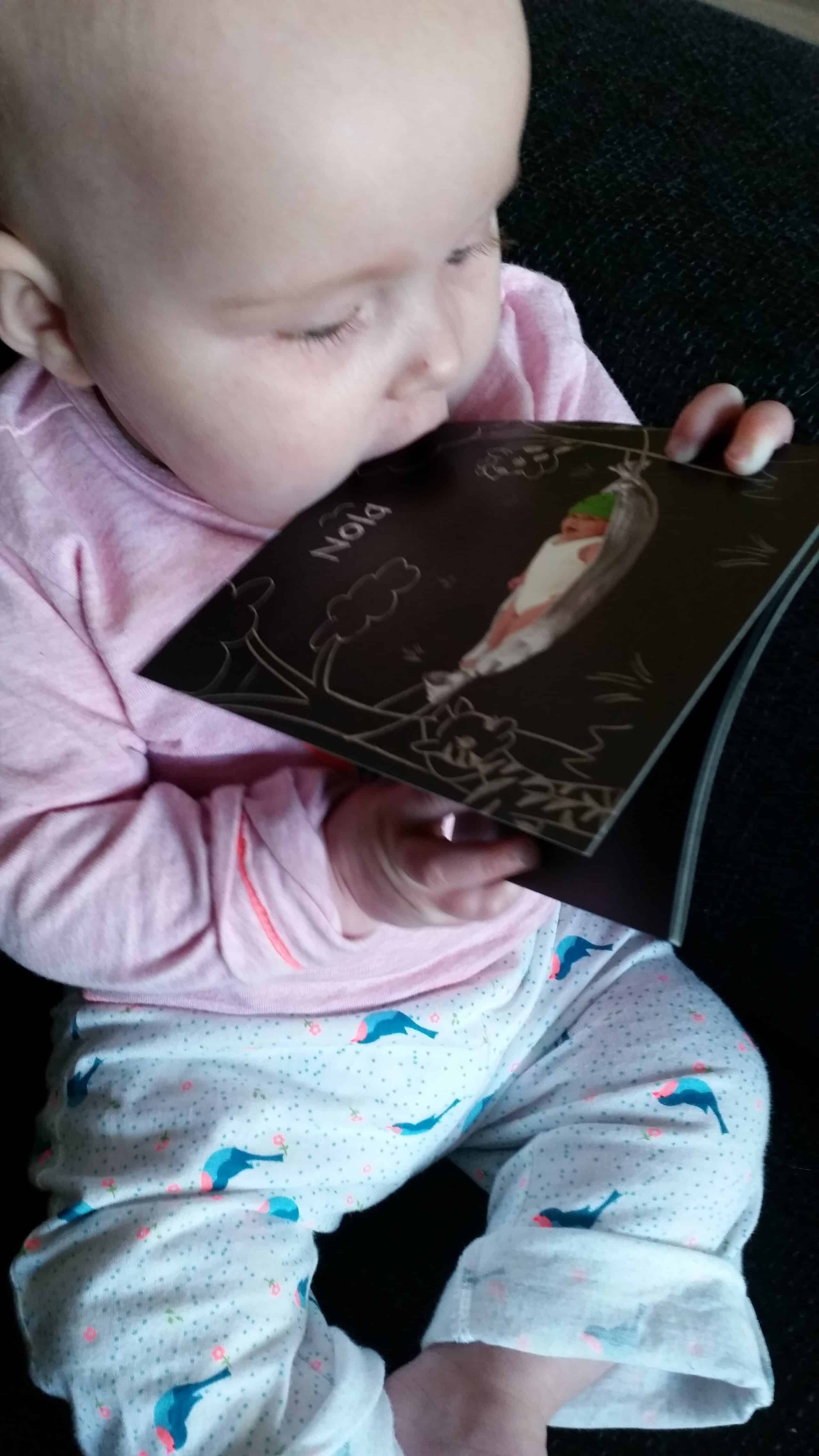 Nola vindt het kaartje in ieder geval om op te vreten ;-). Ik kan nog maar moeilijk een foto maken van Nola en iets in haar handen of het zit al in haar mond haha.