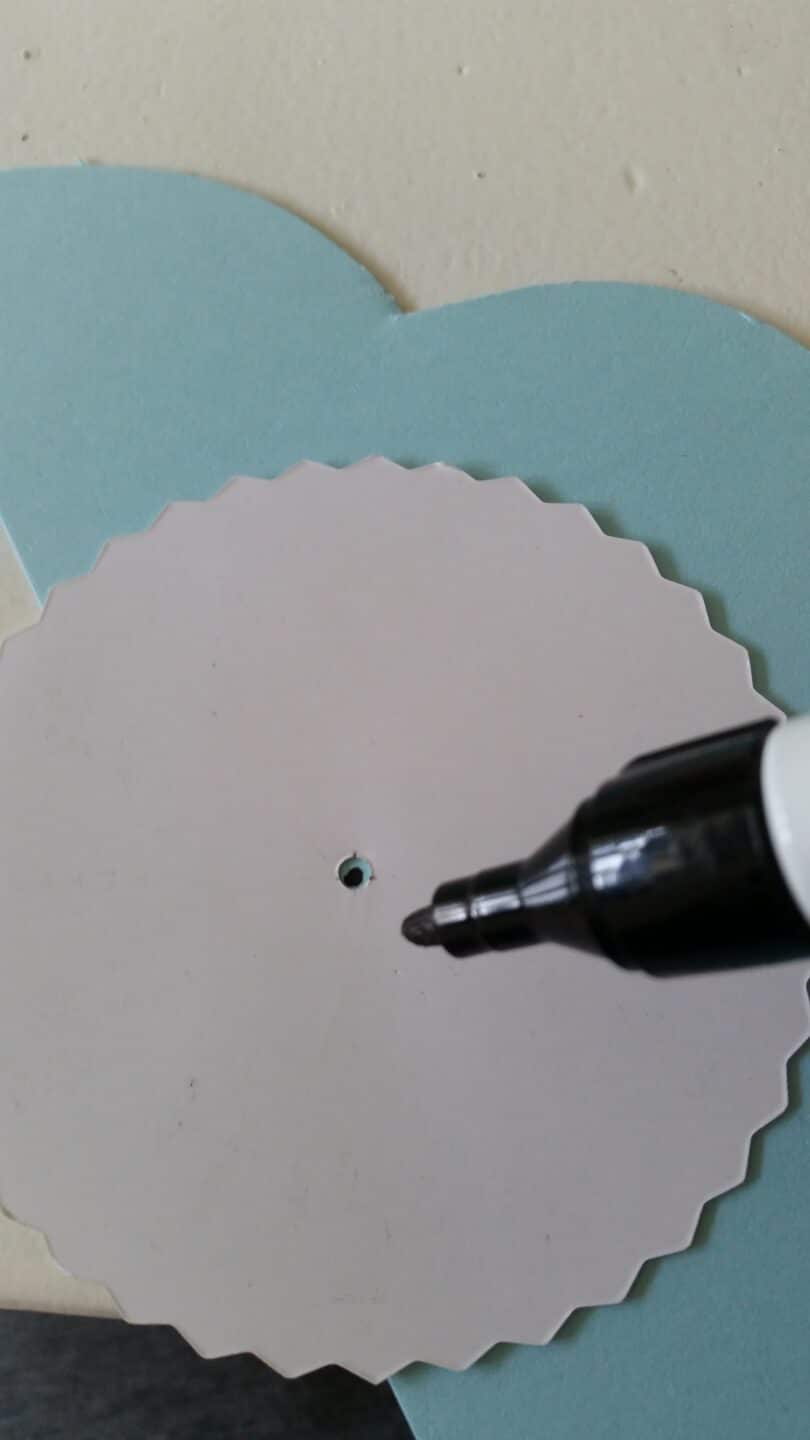 Vervolgens prik ik de pin op de stip en doe ik de parkeerschijf om deze pin. De parkeerschijf zit nu aan één van de twee uitgeknipte auto’s vast.