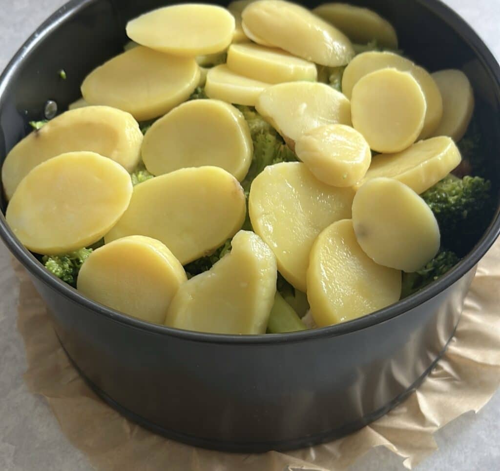 - Verdeel wat aardappelschijfjes over de bodem tot deze mooi bedekt is. Schep het mengsel van broccoli en stukjes gerookte kip in de ovenschaal en bedek deze weer met aardappelschijfjes. Giet vervolgens het mengsel van kookroom, geraspte kaas en kruiden er overheen.
