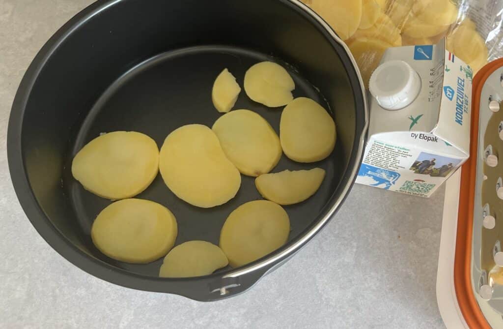 - Als je geen voorgekookte aardappelschijfjes hebt, kook ze dan kort voor, zodat ze gaar maar stevig blijven.