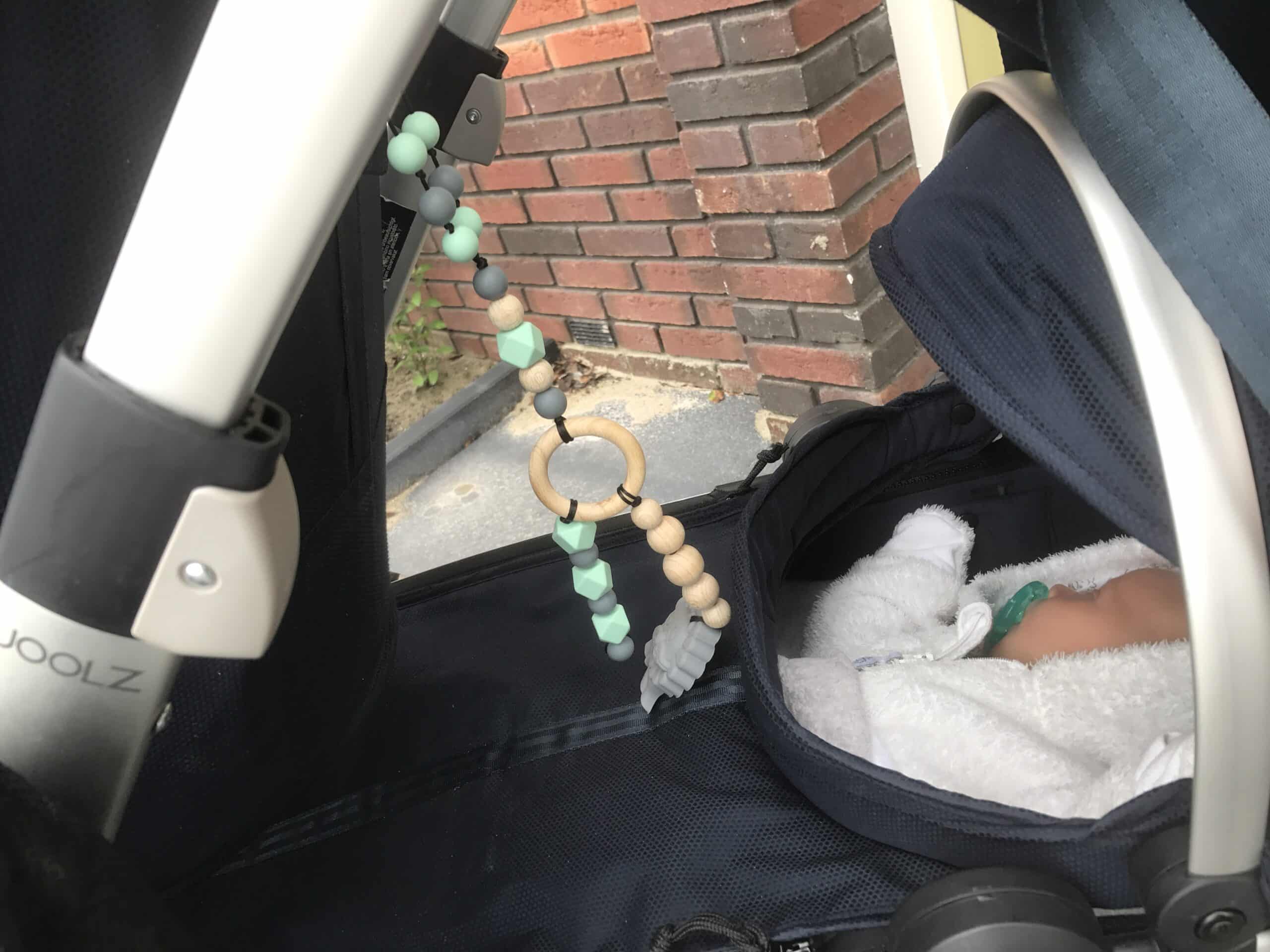 Dit speelkoord kan je bijvoorbeeld aan de stang van je maxicosi hangen. Ik heb hem aan de Joolz gehangen. Zoals sommige van jullie al wel weten hebben wij een Joolz Geo. Dit is een kinderwagen waar twee kindjes in kunnen. Nola zit boven en Liam onder. Aan de achterkant van het bovenste zitje (waar Nola in zit) zitten lusjes. Ik weet niet waar deze lusjes voor zijn, maar wij gebruiken deze voor het speelkoord. Zo komen die lusjes ook eens van pas ;-).