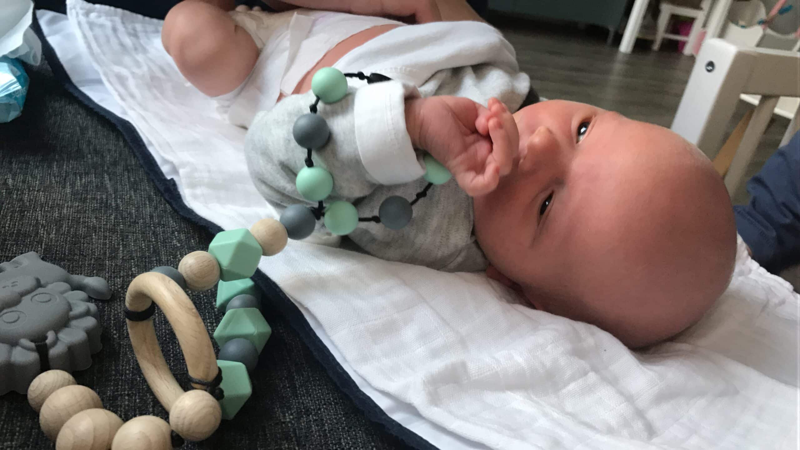 Liam had hier heel toevallig het speelkoord vastgegrepen. Dit kan hij natuurlijk nog niet bewust doen. Hij is pas één maandje oud.