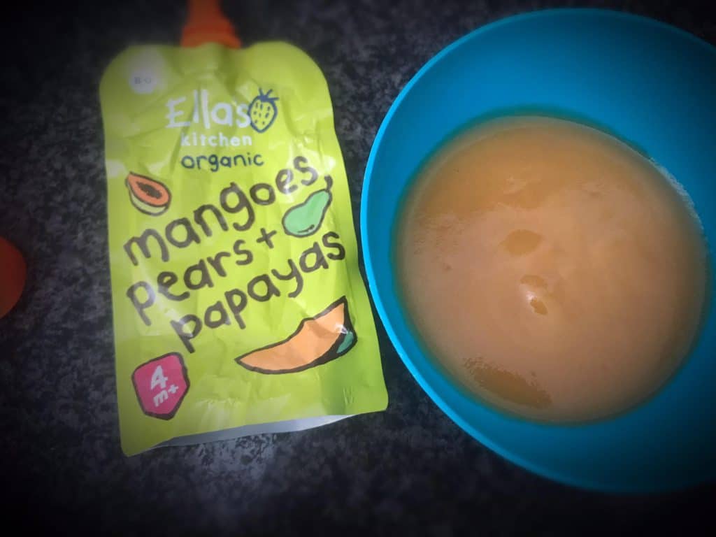 Zo heb je bijvoorbeeld van Ella’s Kitchen Organic en knijpzakje met mango, peer en papaya. Zelf heb ik volgens mij nog nooit papaya op. Ella’s Kitchen heeft dus knijpzakje. Dat is heel handig voor onderweg. Je kan het zo direct in de mond van je baby spuiten, op een lepeltje spuiten (lijkt mij fijner) of leeg knijpen in een kommetje. Ik heb dit keer gekozen voor dat laatste, want we waren thuis.