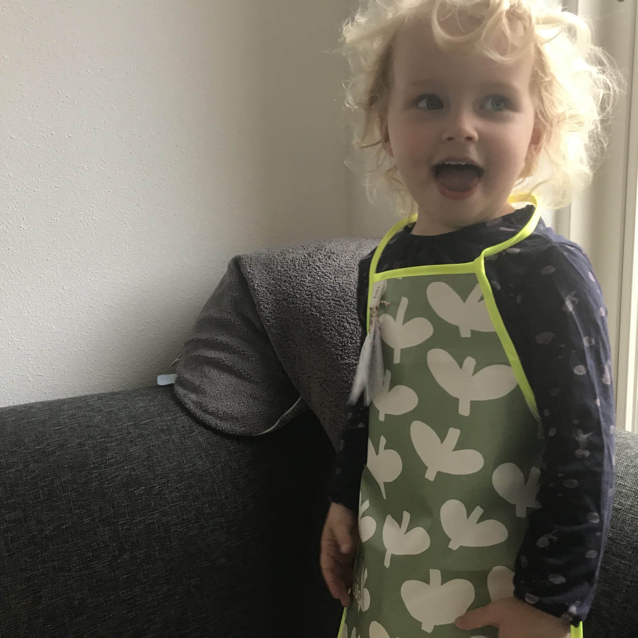 Nola vindt het schort “mooi” zegt ze. Ik vind de dessin en de kleuren ook heel mooi en leuk. Als er er eten op het schort komt veeg je het er makkelijk af. Op de website van Toeti For Kids zie je nog meer verschillende keukenschorten voor kinderen.