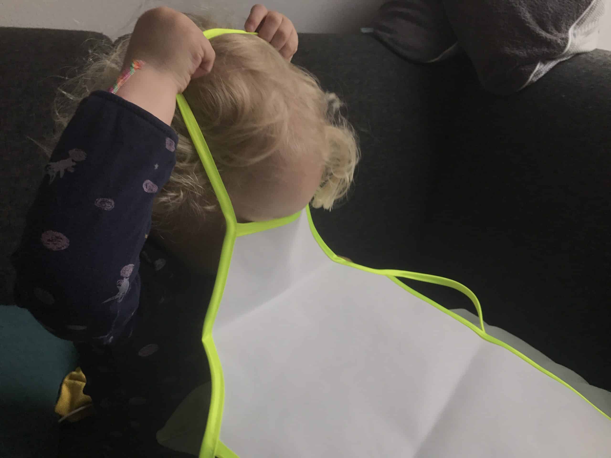 Als ik aan het koken ben vraagt Nola vaak “Samen pelen mama”. Dan wil ze eigenlijk op het aanrecht zitten terwijl ik kook en meestal eet ze dan bijvoorbeeld de snoeptomaatjes op, of een blokje kaas. Nu heeft Nola een schort en kan ze deze om wanneer ze op het aanrecht zit ;-). Dan voelt het voor haar extra dat ze mee doet.