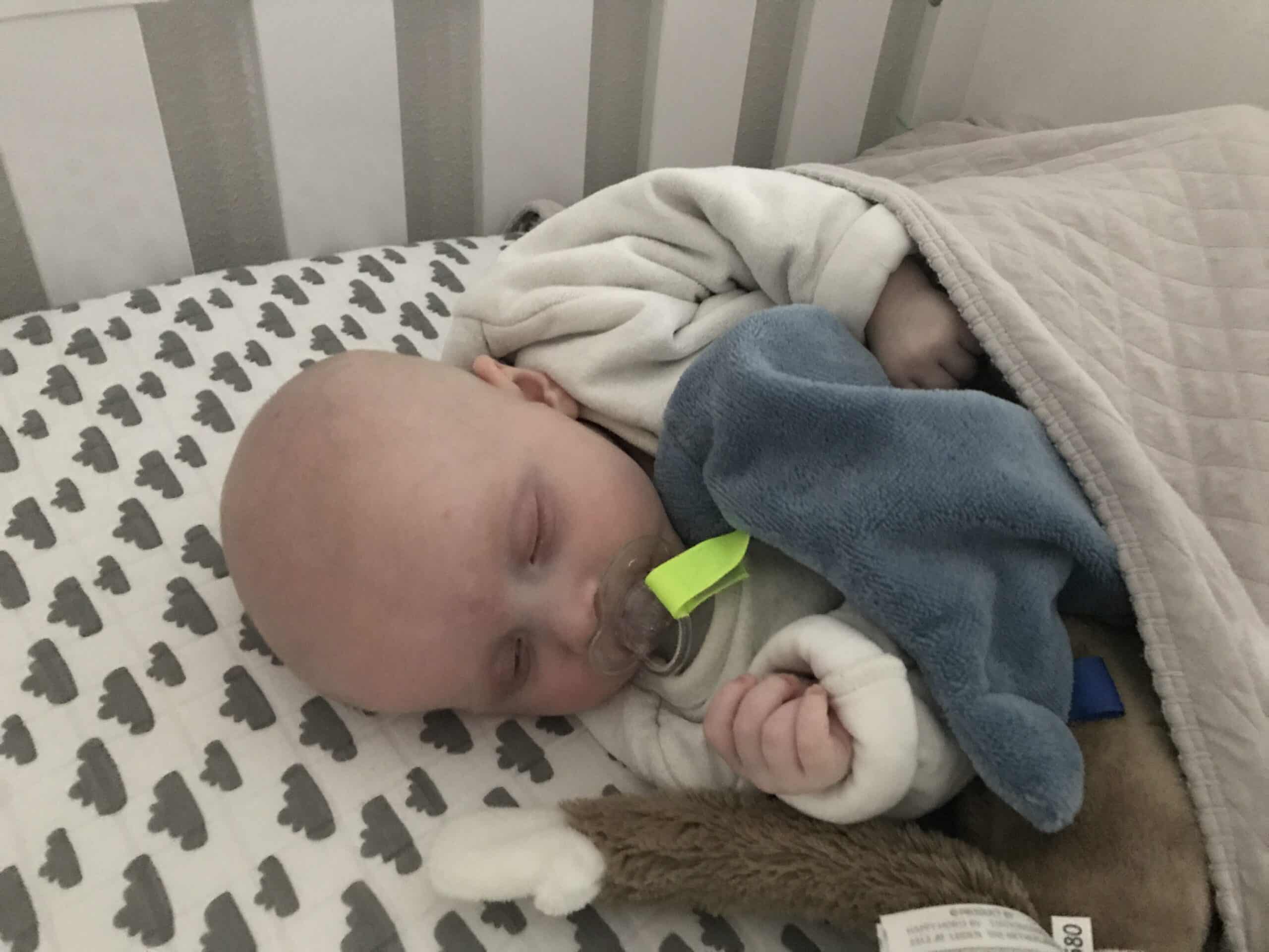 Het speendoekje is verder donkerblauw/grijs met daaraan verschillende kleuren labels. Het ene labeltje is zacht en het andere iets ruwer zo kan Liam lekker aan alle labeltjes friemelen en voelen. Goed voor de sensomotorische ontwikkeling. ;-) Ook zit er een klein rammeltje in het doekje. Deze is zachtjes en klinkt fijn. Liam wordt er niet wakker van.
