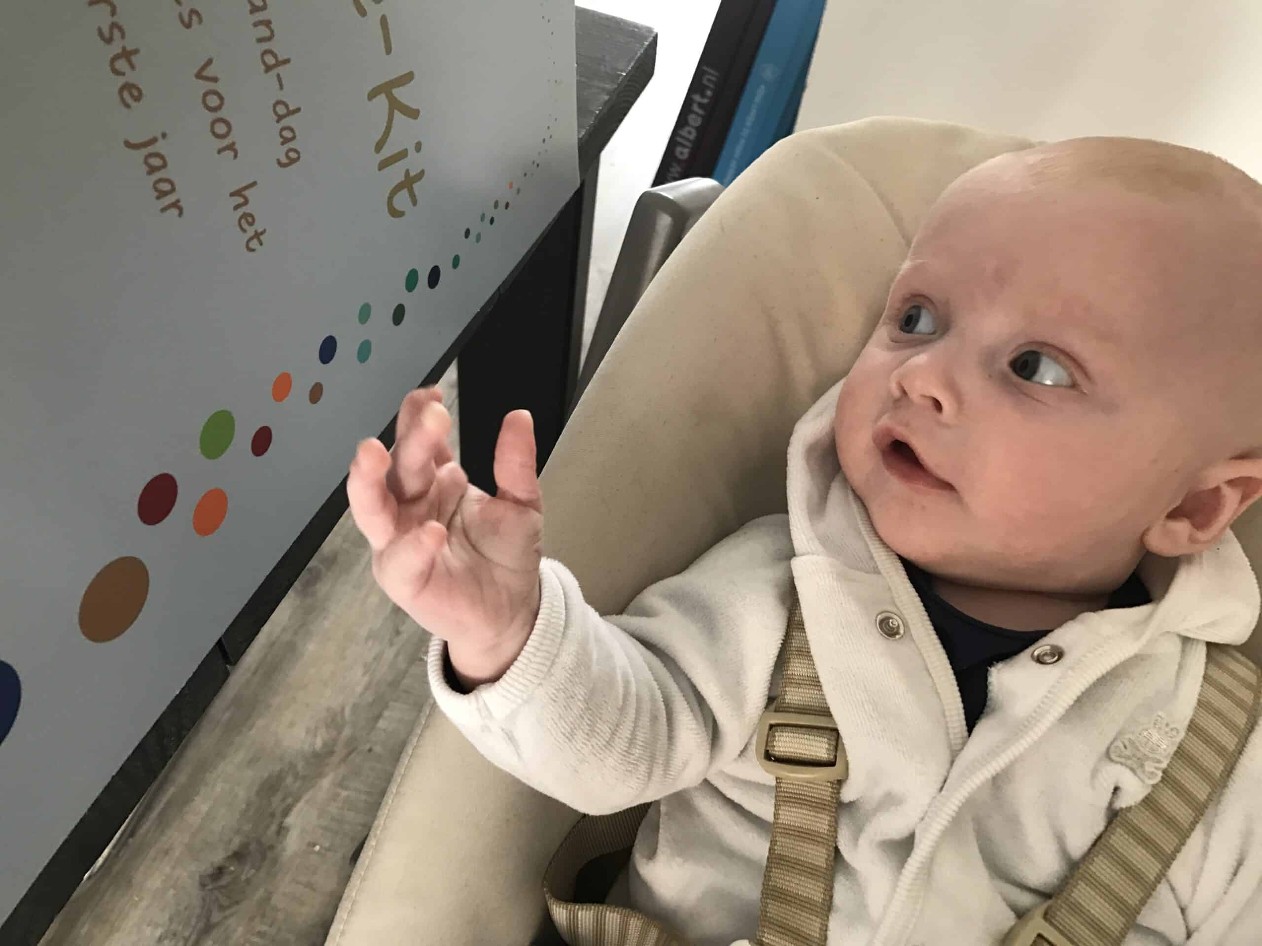 En moet je hem nou eens zien! Een vrolijk mannetje van drie maanden. Wat een verschil he!?