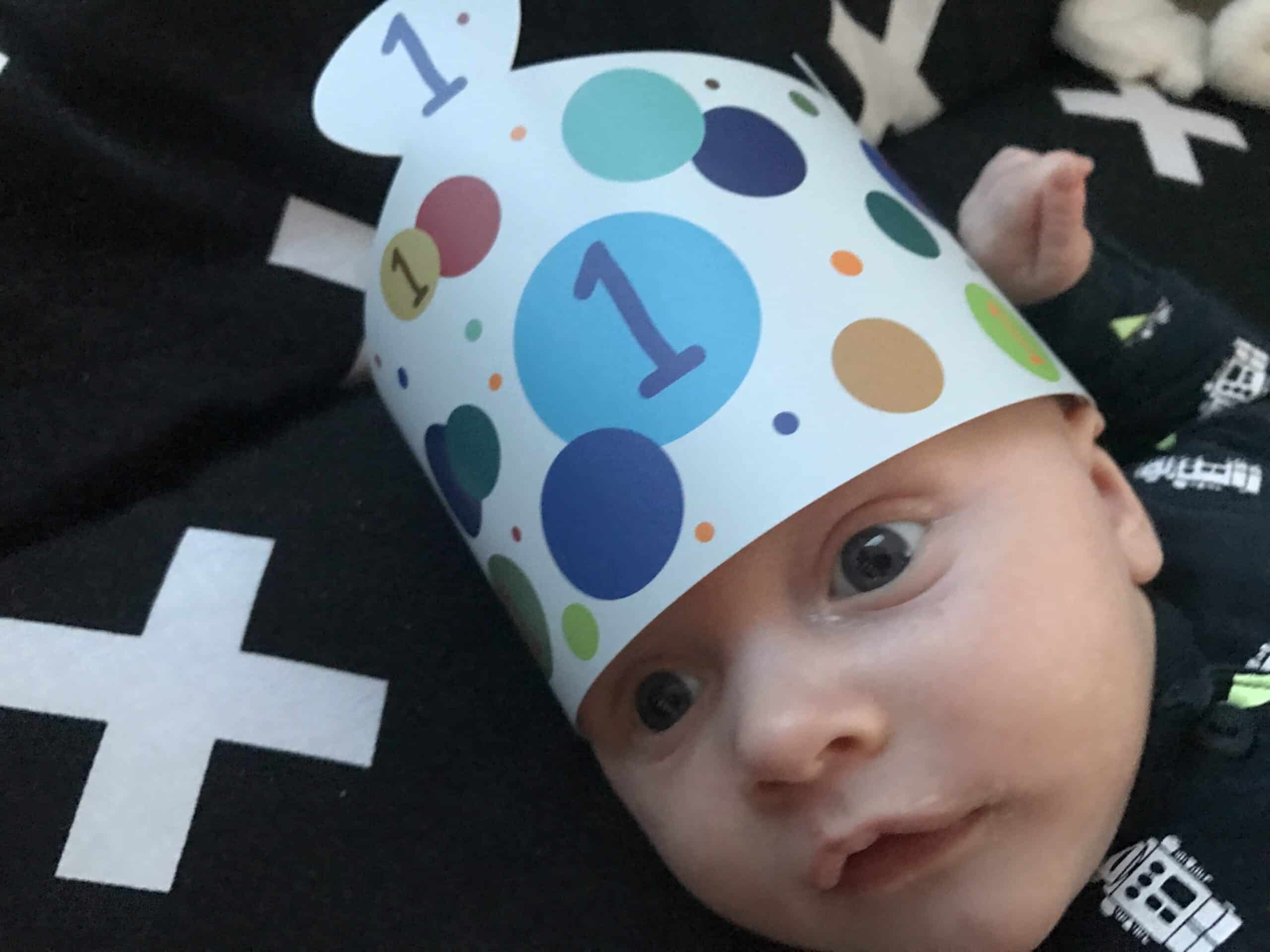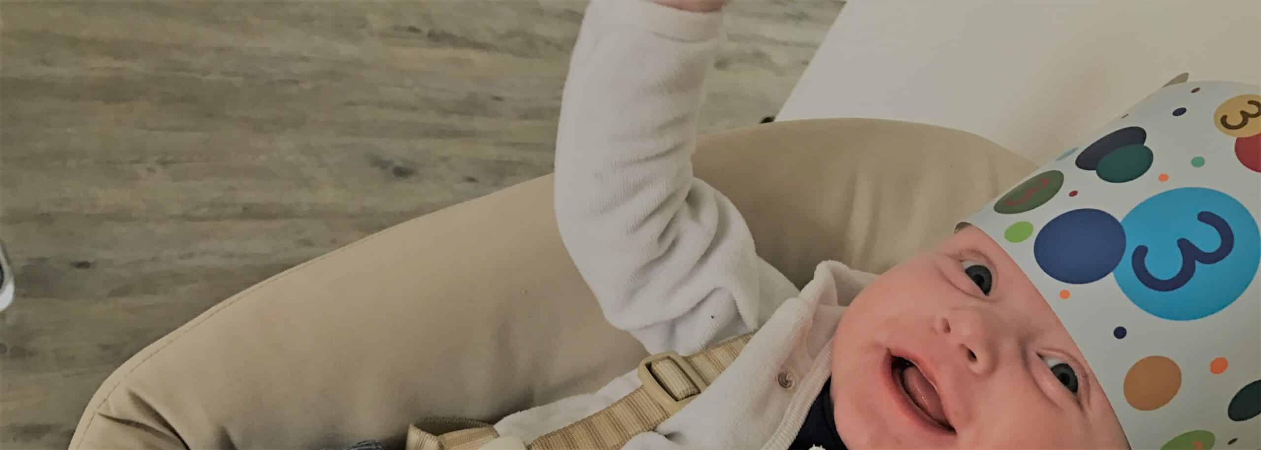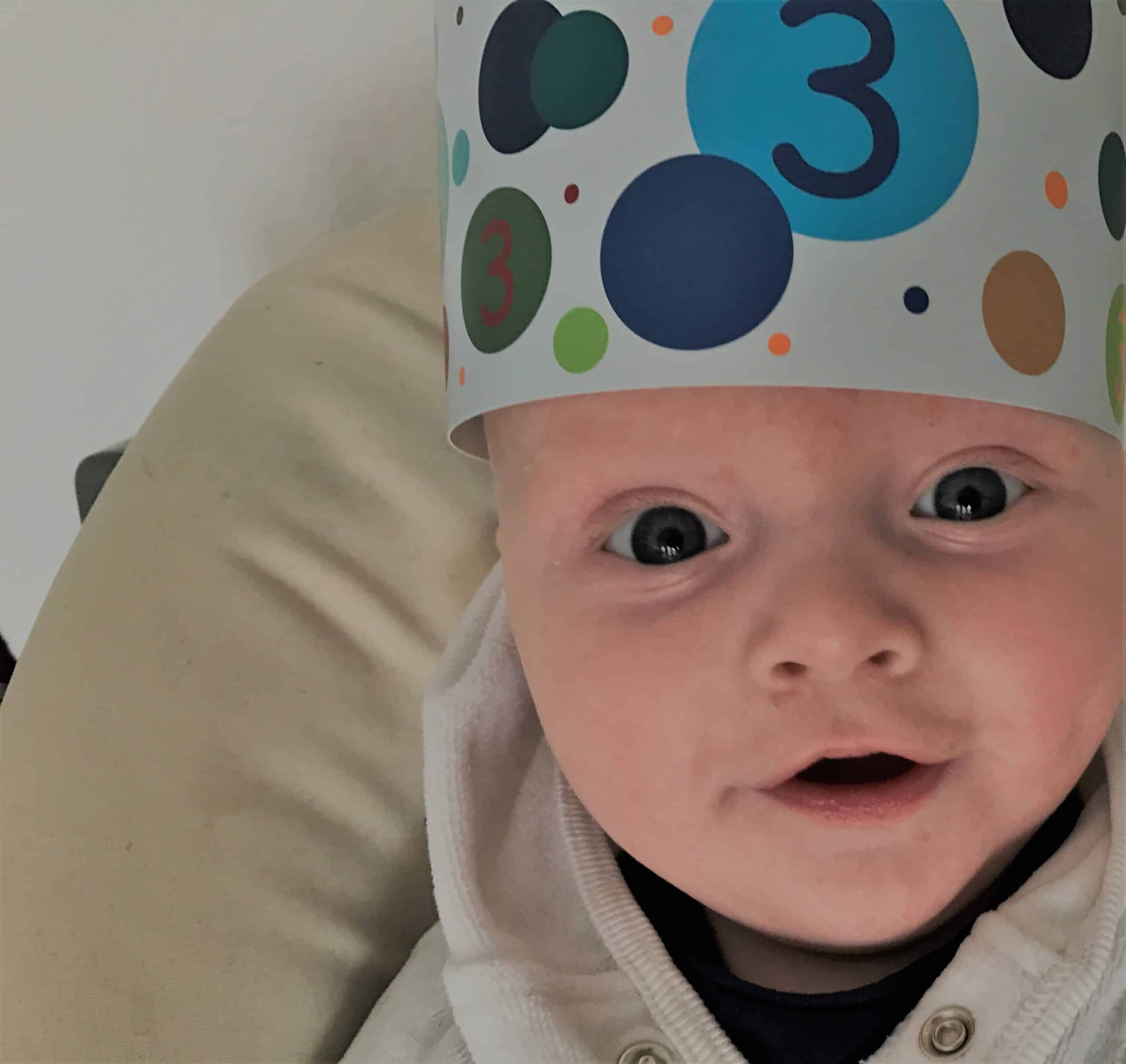 Rechts zie je de kroontjes en links allemaal vierkantjes met cijfers. De kroontjes staan voor het aantal maanden dat je kindje is. Elke maand maak je een mooie foto van je kindje met het kroontje die staat voor het aantal maanden. Een ver-maand-dag. Liam is drie maanden dus we hebben drie foto’s met kroontjes. Dit is de foto van Liam met één maand.
