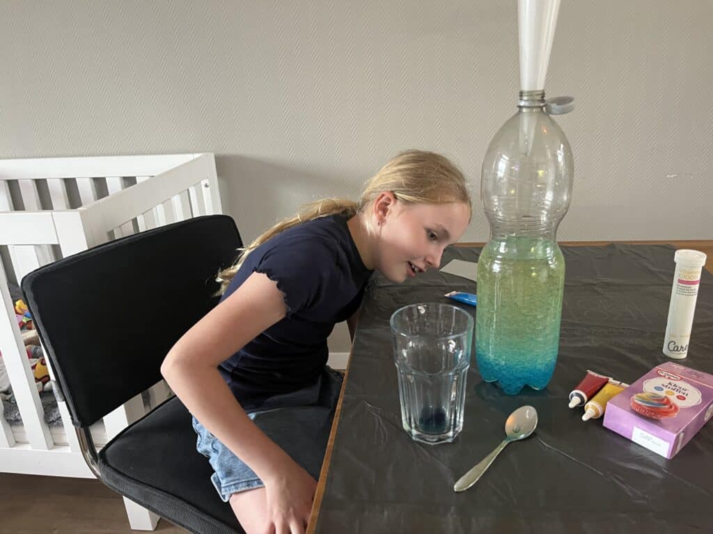 Stap 4: Daarna stop je een bruistablet in de fles. Wanneer het stopt met borrelen doe je er eventueel nog een bruistablet bij. Let op dat je niet de dop op de fles doet.