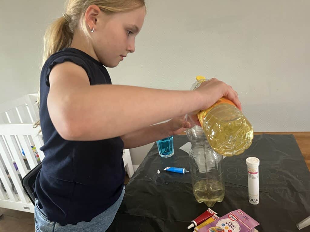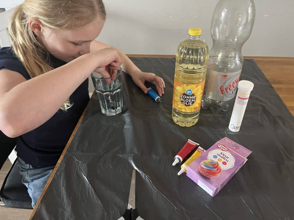 Dit experiment heb je vrij snel gedaan en geeft geen puinhoop zoals ik dacht. Kijk wel uit met de vloeistof. Een tafelkleed en een schort zijn niet overbodig ;-).