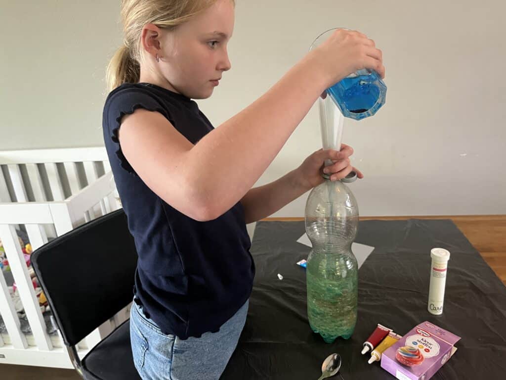 Stap 1: Nola pakte als eerst een glas water en deed hier een kleurstof bij. Ze koos voor de kleur blauw. Er moest nog best veel van de kleurstof doorheen om een mooie kleur blauw te krijgen.