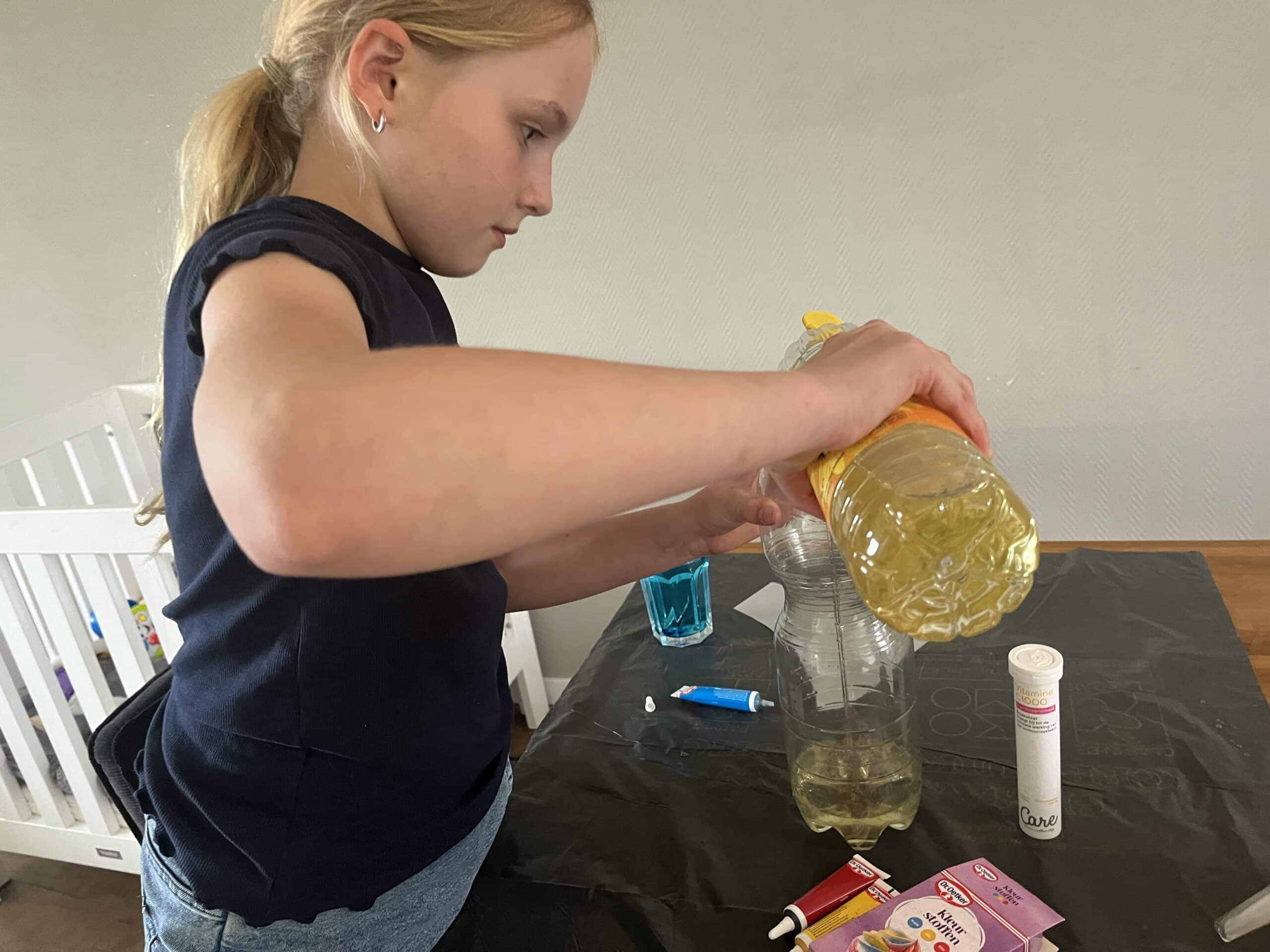 Wat heb je hiervan geleerd? De vloeistof olie is lichter dan de vloeistof water. Daarom blijft de olie op het water drijven. Olie en water mengen dus niet met elkaar. Een bruistablet laat kleine belletjes vrij die opborrelen. In een bruistablet zit namelijk kooldioxide. Kooldioxide neemt het water mee naar boven. Hierdoor krijg je het effect van een lavalamp.